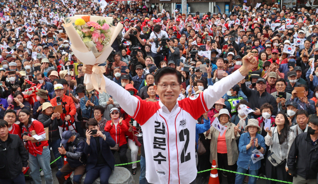 국민의힘 김문수 대선후보가 공식 선거운동 둘째 날인 13일 부산을 찾았다. 자갈치시장을 방문한 김 후보가 유세전을 펼치고 있다.