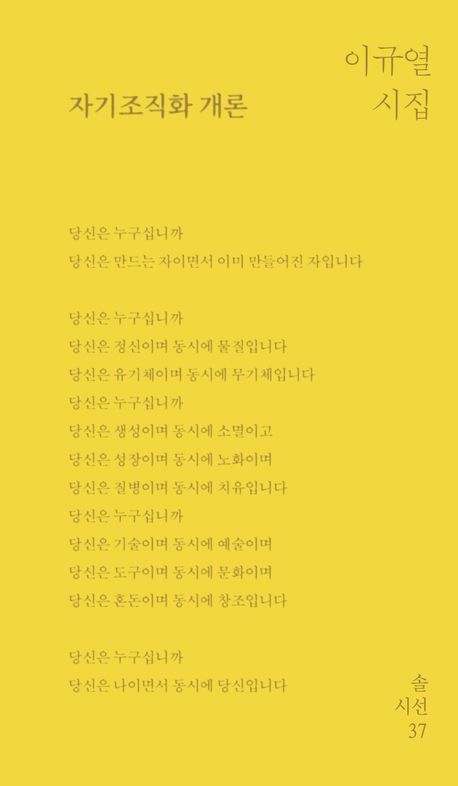 의사이자 시인인 저자의 세 번째 시집. ‘자기조직화 개론’ 연작 15편을 통해 생명, 사랑, 우주, 관계, 시간, 고통, 자아가 어떤 방식으로 ‘스스로를 조직하는가’ 묻는다. 의학과 철학, 불교적 세계관을 넘나들며 기존 서정시의 틀을 흔들기도 한다. 자연과학 지식을 인문학적 안목으로 재발견하거나 해석한 작품 44편이 실렸다. 이규열 지음/솔/116쪽/1만 4000원.