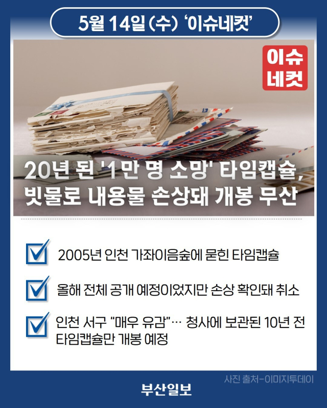 20년 전 인천 서구의 한 녹지에 묻힌 타임캡슐에 빗물이 새어 들어가 개봉이 무산됐습니다. 다만 청사 내에 보관돼 손상되지 않은 10년 전 캡슐은 개봉됩니다. 인천시 서구는 2005년 가좌이음숲에 묻은 타임캡슐을 올해 구민의 날 행사에 맞춰 개봉하려던 계획을 취소했다고 14일 밝혔습니다. 해당 플라스틱 캡슐에는 20년 전 가좌이음숲 1단계 완공을 축하하며 주민 약 1만 명의 소망 등이 담긴 편지가 보관돼 있었습니다. 서구는 앞서 2015년 구민의 날 행사에서 캡슐 일부를 개봉했으며 올해 전체 공개를 할 계획이었습니다. 다만 타임캡슐을 확인한 용역업체가 캡슐에 빗물이 새어 들어가 내용물이 훼손된 사실을 서구에 전달했고, 이에 서구는 10년 전 서구 인구 50만 명 돌파 기념 타임캡슐만 개봉하기로 했습니다. 해당 캡슐은 청사에 보관돼 있어 내용물 손상이 발생하지 않았습니다. 서구 관계자는 "주민들의 추억이 담긴 타임캡슐을 개봉하지 못해 유감스럽다"며 안타까움을 전했습니다.