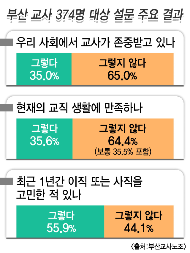 이 같은 부실 대응은 교사들의 자존감과 업무 만족도를 떨어뜨려 교육 전반의 질 저하로 이어질 수 있다는 우려가 나온다. 교사노조가 지난달 23일부터 이달 7일까지 진행한 설문조사에 따르면, 부산 교사 374명 중 ‘사회에서 교사가 존중받고 있다고 생각하느냐’는 질문에 65.0%(243명)가 부정적으로 답했다. 또한 ‘최근 1년간 이직 또는 사직을 고민한 적 있느냐’는 항목에는 55.9%(209명)가 ‘그렇다’고 답했다. 이들이 꼽은 주요 이유는 ‘교권 침해 및 과도한 민원’(51.3%), ‘낮은 급여’(31.6%)였다.