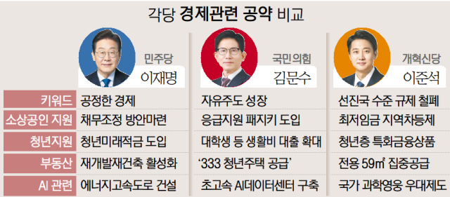 6·3 대선에서 맞붙는 더불어민주당 이재명 후보와 국민의힘 김문수 후보의 10대 공약이 베일을 벗었다. 두 후보 모두 ‘경제’를 1순위로 꼽으며 인공지능(AI)을 필두로 한 신산업 육성을 당면 과제로 제시했다. 연구개발(R&D) 투자 확대가 필요하다는 의견도 같았다. 다만 경제 활성화로 향하는 경로는 완전 달랐다. 이 후보는 ‘공정 경제’, 김 후보는 ‘자유 주도 성장’을 내걸었다. 개혁신당 이준석 후보는 ‘청년 맞춤형’ 특화 정책으로 표심 공략에 나섰다.