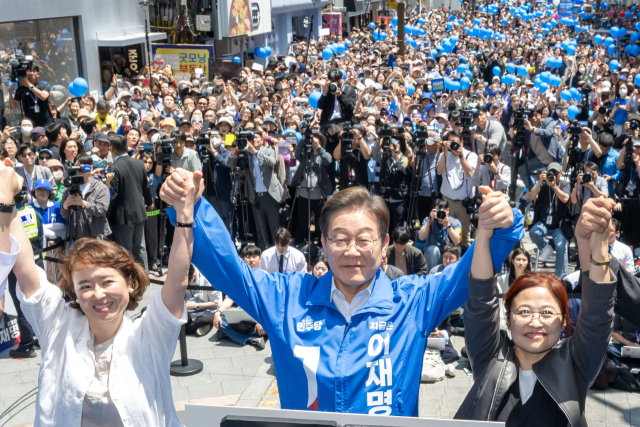 6·3 대통령 선거가 20일 앞으로 다가온 14일 각 당 후보들의 부산·울산·경남(PK) 구애가 고조되는 가운데, 더불어민주당 이재명 대선후보가 이날 부산 서면에서 유세전을 펼치고 있다. 김종진 기자 kjj1761@