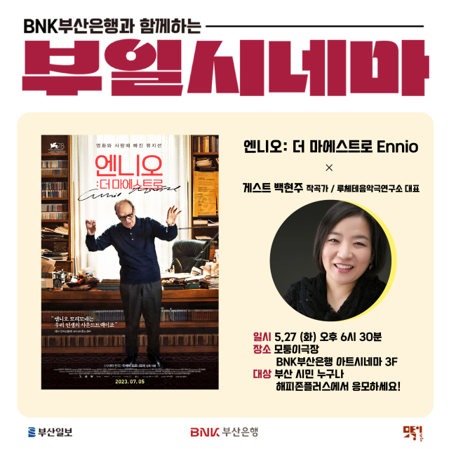 BNK부산은행이 후원하는 부일시네마는 매월 마지막 주 화요일 오후 7시 모퉁이극장에서 열린다. 다만 ‘엔니오’는 러닝타임이 2시간 30분에 달해 예외적으로 상영 시작 시간을 당겼다.