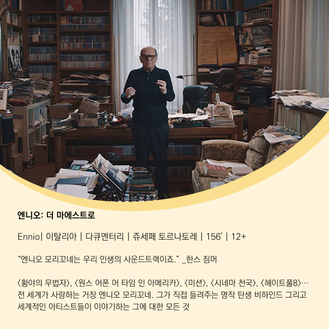 시네필이라면 모를 수 없는 모리꼬네는 ‘황야의 무법자’(1966), ‘원스 어폰 어 타임 인 아메리카’(1984), ‘미션’(1986), ‘시네마 천국’(1990), ‘헤이트풀8’(2016) 등 수많은 명화에 삽입된 음악을 작곡한 전설적인 거장이다. 작품을 관람하지 못한 사람도 ‘황야의 무법자’나 ‘미션’에 삽입된 곡은 한 번쯤 들어봤을 것이다.