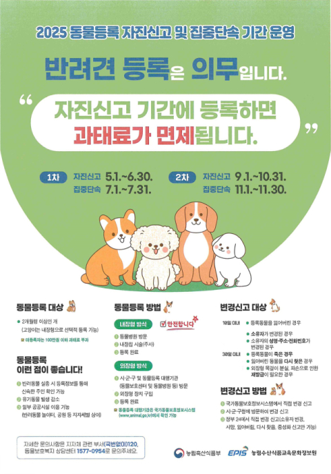 자진신고 기간이 끝나는 7월과 11월 관내 공원, 산책로를 중심으로 반려견 동물 등록 여부를 집중 단속할 계획이다. 등록하지 않거나 변경 사항을 신고하지 않으면 과태료 등 행정처분을 받을 수 있으며 반려동물 놀이터 등 일부 공공시설 출입이 제한될 수 있다.