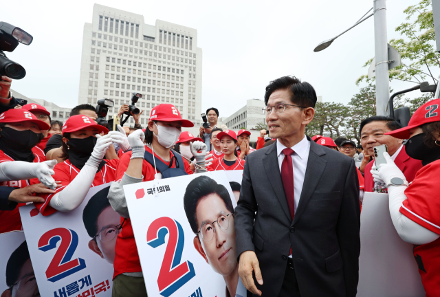 국민의힘 김문수 대선 후보가 15일 서울 서초구 대법원 앞에서 열린 사법부 수호 및 더불어민주당 규탄대회에서 퇴장하며 선거운동원들과 인사하고 있다. 연합뉴스