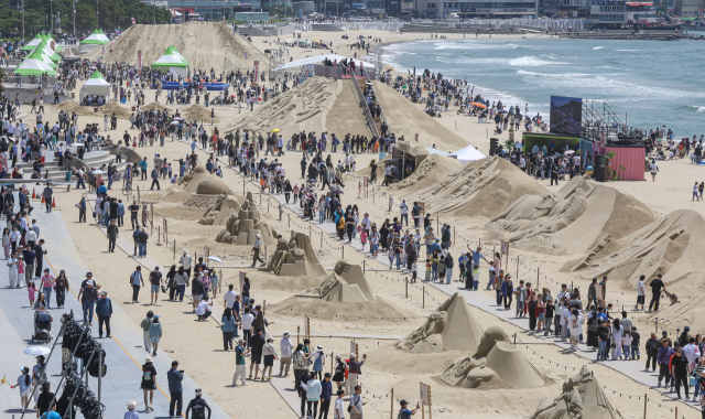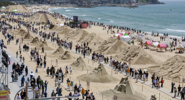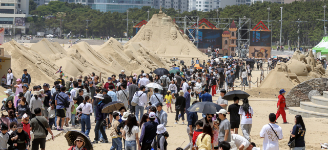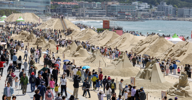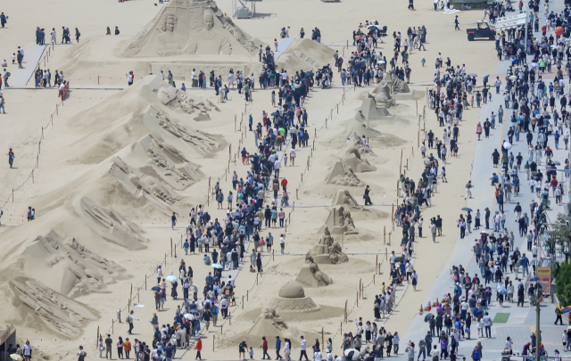올해 20주년을 맞은 해운대 모래축제가 진행중인 18일 부산 해운대구 해운대해수욕장을 찾은 시민과 관광객들이 다양한 모래조각 작품을 구경하고 있다. 이번 축제는 모래로 만나는 K-컬처를 주제로 세계인들에게 사랑받은 한국 문화 20여개 작품이 전시된다. 모래 작품들은 다음 달 8일까지 전시된다. 김종진 기자 kjj1761@