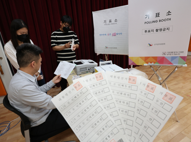 제21대 대통령 선거를 앞두고 19일 경기도 수원시 우만1동 행정복지센터에서 선거관리위원회 관계자들이 사전 투표 전산장비 모의시험을 하고 있다. 사전 투표는 이번 달 29∼30일 이틀 동안 실시된다. 연합뉴스