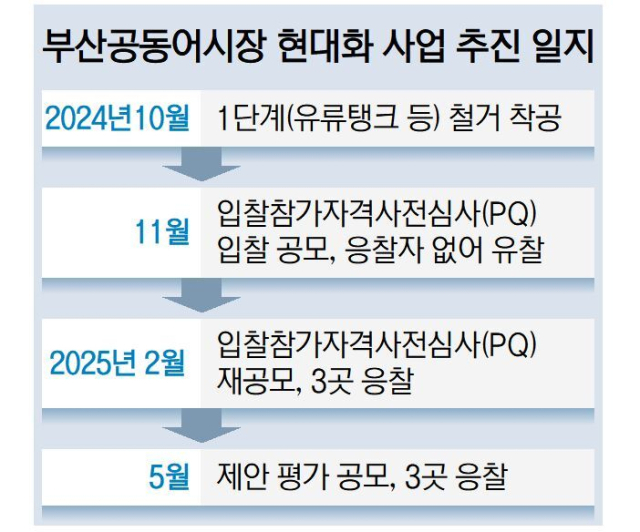 19일 부산시에 따르면 지난 13일 부산공동어시장 현대화 사업 공모 입찰이 마감됐으며, HJ중공업, 대보건설, 한얼ENC 등 3개 건설사가 참여해 입찰 참가자 자격 등록, 설계안 등을 제출했다. 시는 지난해 11월 본 공사 시공사 선정을 위한 입찰참가자격사전심사(PQ) 공모를 진행했지만, 공사 기간이 1187일(약 39개월)로 짧다는 평가가 나오면서 단 한 곳도 응찰하지 않았다. 이후 지난 2월 입찰자가 최대 50%(593일)까지 추가 연장을 제안할 수 있도록 조건을 완화했고, 3곳이 응찰했다.