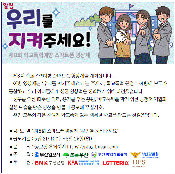 이번 영상제는 '우리를 지켜주세요'라는 주제로, 학교폭력 근절과 예방에 모두가 동참하고 우리 아이들에게 선한 영향력을 전파하기 위해 마련했습니다.