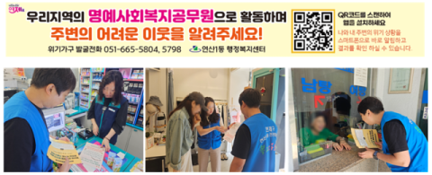 부산 연제구 연산1동(동장 이수영)은 5월 한 달간 복지사각지대 해소와 위기가구 발굴을 위한 명예사회복지공무원을 집중 모집한다.