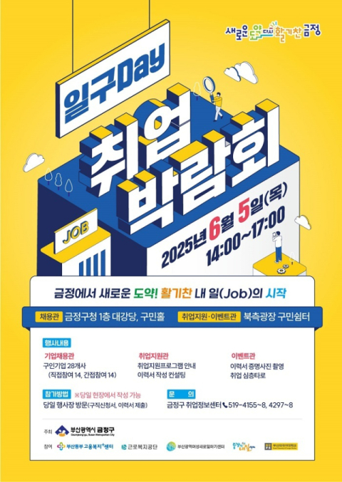 부산 금정구(구청장 윤일현)는 경기침체로 위축된 고용시장에 활기를 불어넣고, 지역 중소기업의 인력난 해소와 구직자에게 취업기회를 제공하기 위하여 오는 6월 5일 오후 2시에서 5시까지 금정구청 1층 대강당 및 구민홀 일원에서 2025년 금정구 일구Day 취업박람회를 개최한다고 밝혔다.