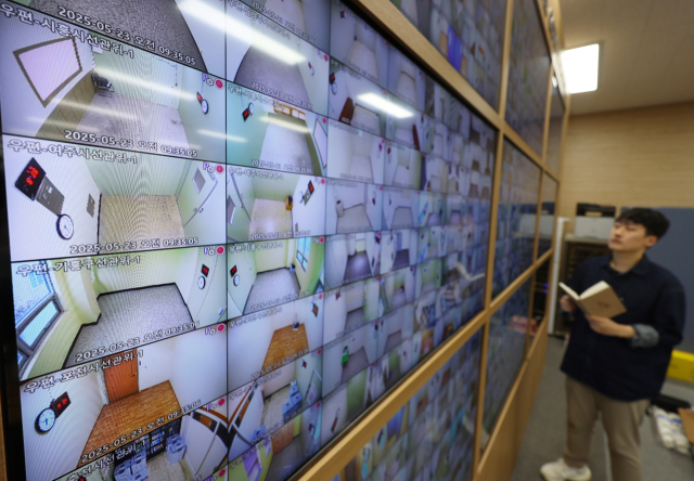제21대 대선을 열하루 앞둔 23일 경기도 과천시 중앙선거관리위원회 선거종합상황실 내 우표투표함 보관장소 CCTV 통합관제센터에서 직원이 모니터링하고 있다. 연합뉴스