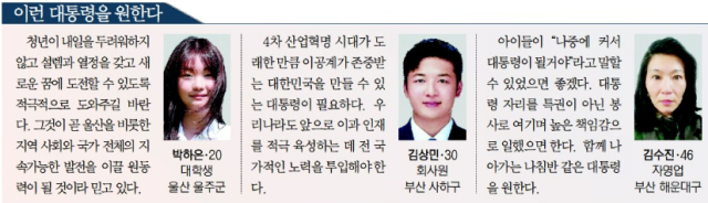 아이들이 “나중에 커서 대통령이 될거야”라고 말할 수 있었으면 좋겠다. 대통령 자리를 특권이 아닌 봉사로 여기며 높은 책임감으로 일했으면 한다. 함께 나아가는 나침반 같은 대통령을 원한다.