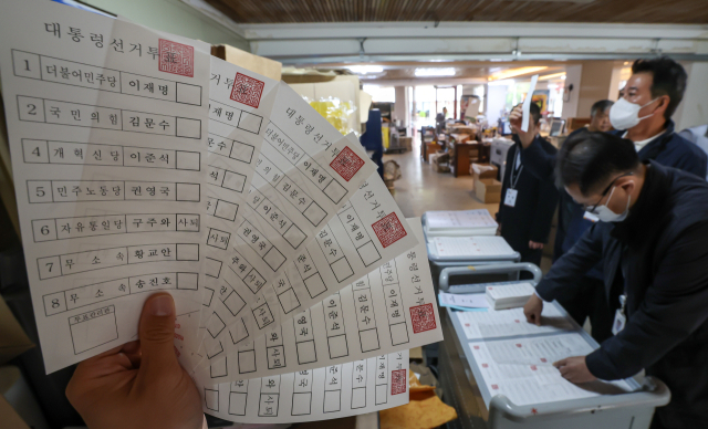 제21대 대통령선거 투표용지 인쇄가 시작된 25일 오전 부산 부산진구 한 인쇄소에서 선거관리위원회 선거관리위원들이 투표용지 인쇄 상황을 점검하고 있다. 대통령선거 사전 투표는 29일~30일, 본 투표는 6월 3일이다.