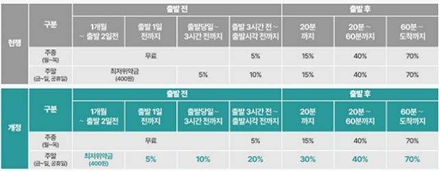 변경되는 주말 위약금 기준은 △열차 출발 2일전까지 400원 △열차 출발 1일전까지 400원 → 5% △출발 당일 3시간 전까지 5% → 10% △출발 3시간 전에서 출발시각 전까지 10% → 20% △출발 후 20분까지 15% → 30%로 강화된다.