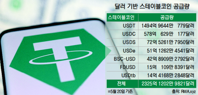 지난 20일 기준 실물연계자산(RWA) 데이터 플랫폼 RWA.xyz에 따르면 스테이블코인 총 공급량은 2325억 달러(322조 원)를 넘어섰다. 이 가운데 테더가 거의 1500억 달러(208조 원)를 차지해 시장 점유율 1위를 기록했다. 미국 써클사가 발행하는 USDC는 약 578억 달러(80조 2억 원)로 두 번째로 큰 규모를 자랑한다.