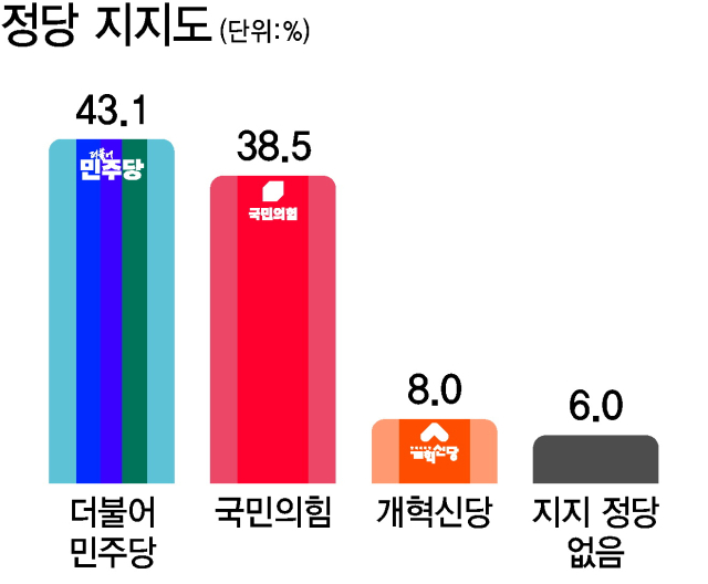 한국지방신문협회 의뢰로(주)에이스리서치가 전국 만 18세 이상 3028명을 대상으로 정당 지지도를 물은 결과, 민주당 43.1%, 국민의힘 38.5%, 개혁신당 8.0% 순으로 나타났다. ‘지지하는 정당 없음’은 6.0% 수준이었다.