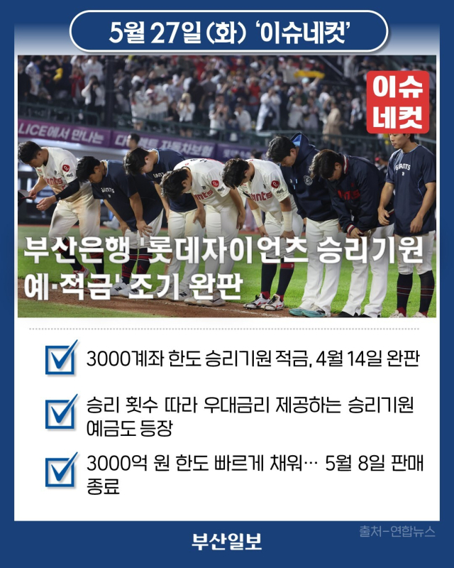 BNK부산은행이 출시한 롯데자이언츠 승리기원 예·적금이 조기에 완판됐습니다. 27일 부산은행에 따르면 지난 3월 말 3000계좌 한도로 출시한 롯데자이언츠 승리기원 적금이 4월 14일에 완판됐습니다. 3000억 원 한도로 출시해 이달 말까지 판매하려던 롯데자이언츠 승리기원 예금에도 가입자가 몰리면서 지난 8일 한도 소진으로 판매가 끝났습니다. 당초 부산은행은 롯데자이언츠가 포스트 시즌에 진출하면 우대금리를 적용했으나, 올해부터는 롯데의 시즌 승리 횟수에 따라 우대금리를 제공하기로 변경한 점, 롯데가 시즌 초반부터 승리를 쌓아가는 점이 고려된 것으로 보입니다. 부산은행은 지역 유소년 야구발전을 위해 롯데자이언츠 승리기원예금 판매 수익금으로 3000만 원을 기부할 예정입니다.