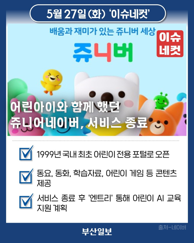 1999년 6월 문을 열었던 국내 최초 어린이 전용 포털 '쥬니버'가 문을 닫았습니다. 27일 네이버에 따르면 쥬니버 웹과 쥬니버TV 앱은 이날 오후 3시 서비스를 종료했습니다. 그간 쥬니버는 동요, 동화, 학습자료와 어린이 게임 등 콘텐츠를 제공했는데요, 일부는 네이버TV 채널들로 이전됩니다. 네이버는 인공지능(AI)·소프트웨어(SW) 교육 플랫폼 '엔트리'를 통해 어린이들의 AI 교육을 지원한다는 계획입니다.
