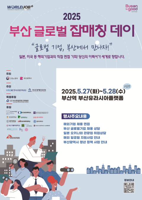 부산시(시장 박형준)는 5월 27일과 28일 양일간 부산유라시아플랫폼에서 '2025 부산 글로벌 잡매칭데이'를 개최한다고 밝혔다.