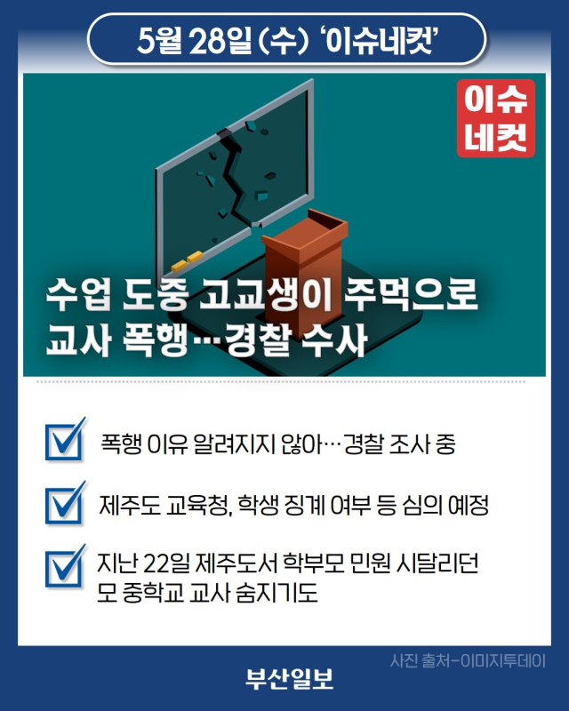 제주도의 한 고등학교에서 학생이 교사를 폭행하는 사건이 발생해 경찰이 수사에 나섰습니다. 28일 경찰에 따르면 전날 오전 제주도의 한 고등학교에서 남학생이 수업을 듣던 도중 교사를 주먹으로 폭행했습니다. 다만 현재까지 학생이 어떤 이유로 폭행을 저질렀는지는 알려지지 않았습니다. 경찰은 "피해 교사가 사건이 알려지는 것을 원하지 않아 정확한 내용을 밝힐 수 없다"고 덧붙였습니다. 도교육청은 교권보호위원회를 열고 해당 학생에 대한 징계 여부 등을 심의할 방침입니다. 한편, 제주도의 모 중학교에서는 교사가 학부모 민원에 시달리다 지난 22일 숨지는 일이 발생하기도 했습니다.