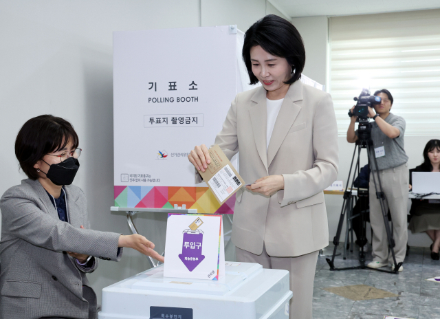 더불어민주당 이재명 대선 후보의 배우자 김혜경 여사가 제21대 대통령선거 사전투표가 첫날인 29일 오전 10시께 부산 동구 초량2동 행정복지센터에 마련된 사전투표소에서 투표를 했다.