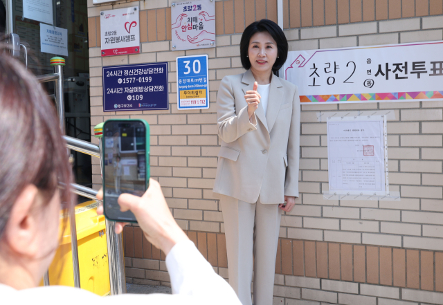 김혜경 여사가 제21대 대선 사전투표가 시작된 29일 오전 부산 동구 초량2동 사전투표소에서 투표를 마친 뒤 인증사진을 찍고 있다. 정종회 기자 jjh@