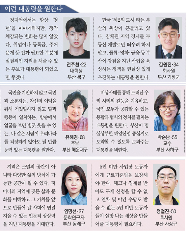 비상사태를 통해 드러난 우리 사회의 갈등을 치유하고, 국민 모두가 공감할 수 있는 통합과 협치의 정치를 펼치는 대통령을 원한다. 부산이 명실상부한 해양산업 중심지로 도약할 수 있도록 도와주는 대통령을 바란다.