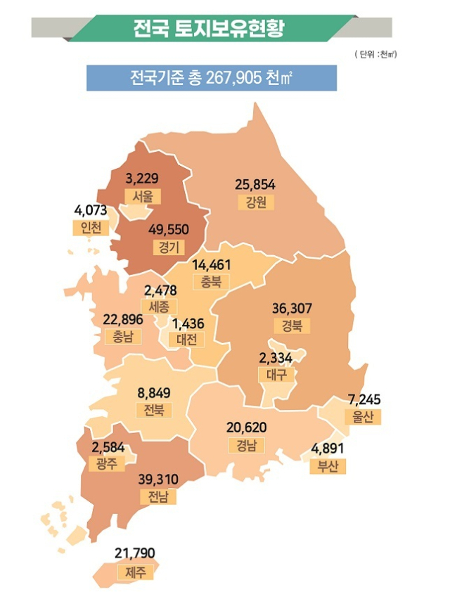 외국인이 보유한 국내 토지 면적은 작년 말 기준 2억 6790만5천㎡로 전년보다 1.2% 증가했다.