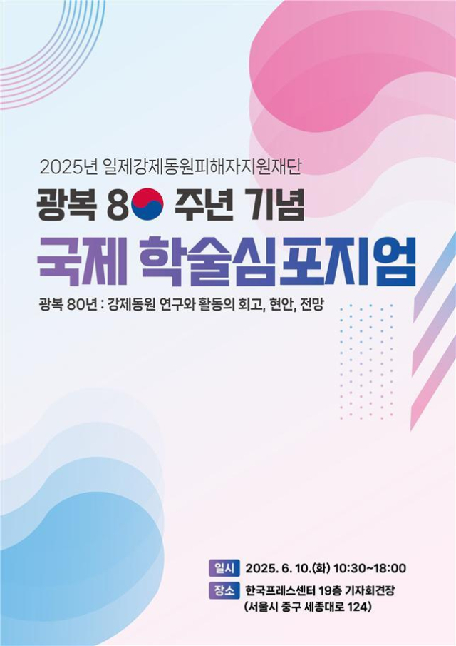 일제강제동원피해자지원재단(이사장 심규선, 이하 ‘재단‘)은 오는 10일 서울 중구 한국프레스센터에서 ‘광복 80년:강제동원 연구와 활동의 회고, 현안, 전망’이라는 주제로 국제 학술심포지엄을 개최한다.