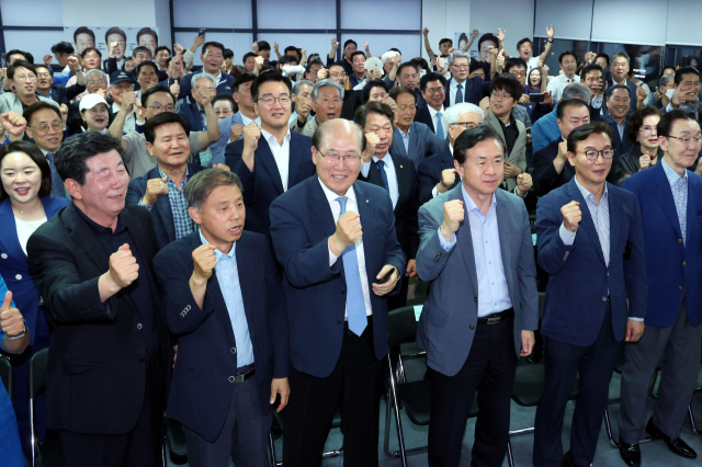 [포토뉴스] 출구조사에 기뻐하는 더불어민주당 부산선대위