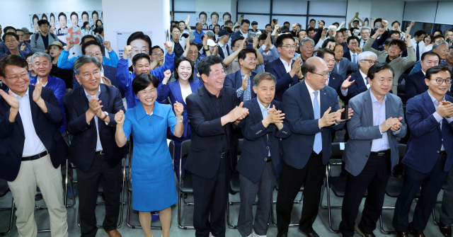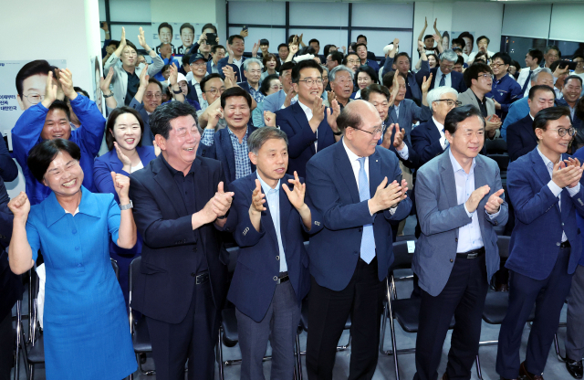 제21대 대통령선거가 실시된 3일 오후 부산 부산진구 더불어민주당 부산시당 선대위 사무실에서 당 관계자들이 출구조사 결과 이재명 후보가 이기는 것으로 나타나자 기뻐하고 있다.