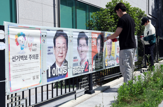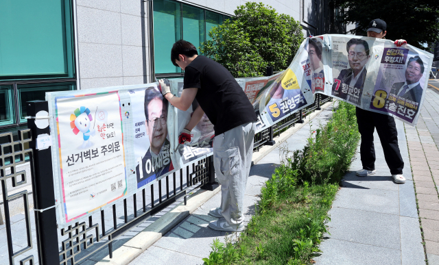 제21대 대통령선거가 4일 더불어민주당 이재명 후보의 당선 확정으로 막을 내렸다. 4일 오전 부산시선거관리위원회 관계자들이 연제구의 한 거리에 부착된 대선 후보 벽보를 철거하고 있다.