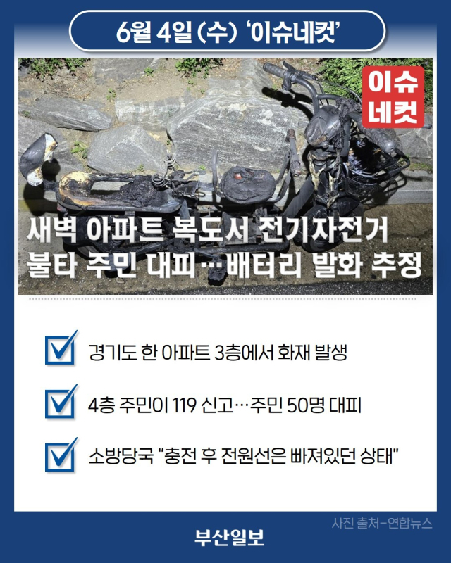 새벽 아파트 복도서 전기자전거 불타 주민 50명 대피…배터리 발화 추정