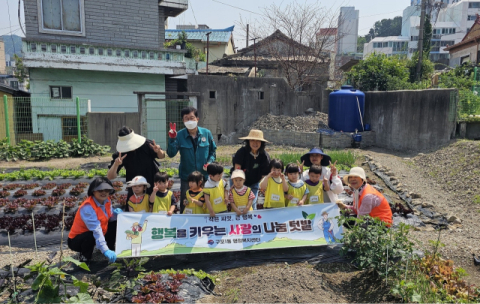 부산 북구 구포1동 행정복지센터(동장 윤수찬)는 지난달 27일 부산북부경찰서 어린이집(원장 김은화) 원아 8명을 초청해 ‘사랑의 나눔텃밭’ 체험행사를 개최했다.