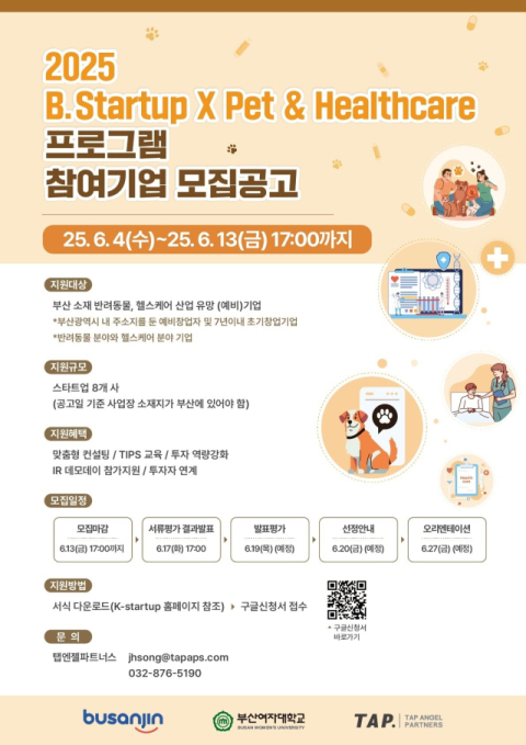부산 부산진구(구청장 김영욱)는 부산여자대학교(총장 정영우)와 함께 부산진구 지역맞춤 특화 창업지원 사업으로 ‘2025년 B.Startup×Pet & Healthcare 프로그램’을 추진한다고 밝혔다.