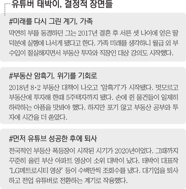 그는 재테크를 위해 시중에 나와 있는 부동산 투자 관련 책이라면 가리지 않고 읽었다. 무턱대고 이런저런 부동산 투자에 손을 대며 실패한 경험도 적지 않았다. 이 기억들을 떠올리며 부동산 정보나 아파트 소개에 관한 유튜브를 만들기 시작했다. 주말에 짬을 내 스마트폰으로 영상을 찍었고, 퇴근 후 졸린 눈을 비벼가며 영상을 편집했다. 태박이란 이름은 아내가 자신을 부르던 애칭에서 따왔다.