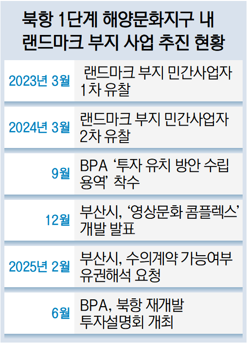 랜드마크 부지는 2030세계박람회 유치 실패, 건설 경기 악화 등이 이어지며 2023년과 지난해 두 차례 입찰에서 사업자가 나타나지 않았다. 그러다 부산시가 지난해 12월 4조 5000억 원 규모의 외국 자본을 유치해 영상문화콤플렉스를 건립하겠다고 발표했다.