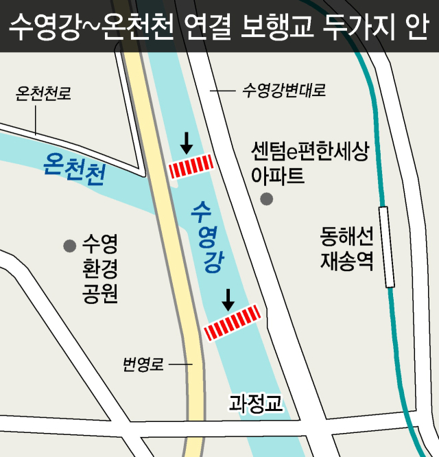 부산 해운대구에서 수영강을 걸어서 온천천으로 갈 수 있는 ‘수영강~온천천 보행교’ 건설의 첫 단추가 끼워졌다. 건설이 확정되면 수영강과 온천천을 잇는 차가 다니지 않는 첫 보행교가 된다.