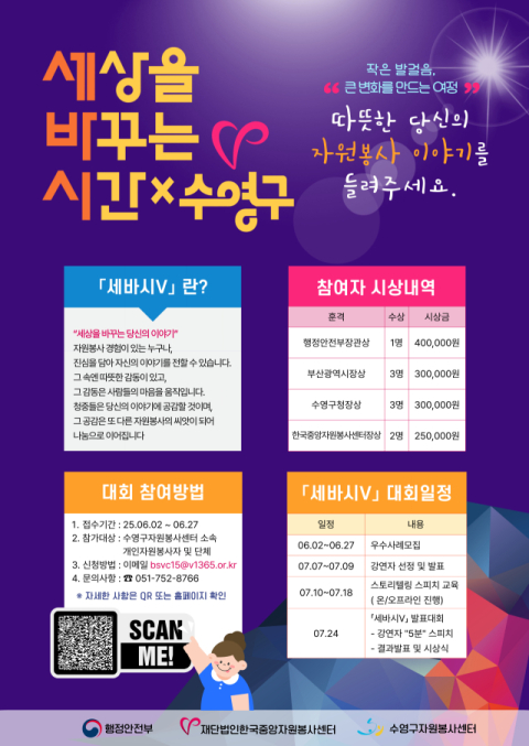 부산 수영구자원봉사센터는 오는 7월 24일 개최되는 ‘세상을 바꾸는 자원봉사 이야기 대회’의 발표자를 모집한다고 밝혔다.