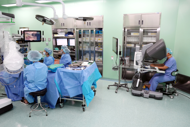 갑상선 로봇수술은 목에 흉터를 남기지 않고 후두신경 보전에도 유리한 장점이 있다. 오른쪽 끝에 콘솔에 앉아서 집도의가 로봇팔을 조정한다. 해운대백병원 제공