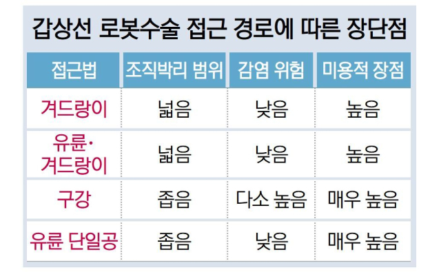 로봇수술은 내시경 기구 대신에 로봇팔을 이용하는 수술법이다. 3D 입체영상과 15배 가량 확대된 시야를 제공해 주기 때문에 수술의 정확성이 높아진다. 로봇팔을 활용해 손 떨림이 보정되기 때문에 정교한 수술이 가능하다. 무엇보다 목에 흉터가 생기지 않는 것이 가장 큰 장점이며 후두신경 보전에도 유리하다.