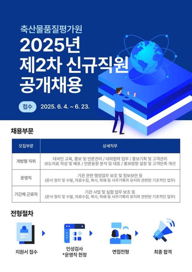 농식품부 소속 공공기관인 축산물품질평가원이 2025년 제2차 상반기 신규직원 공개채용을 진행한다고 9일 밝혔다.