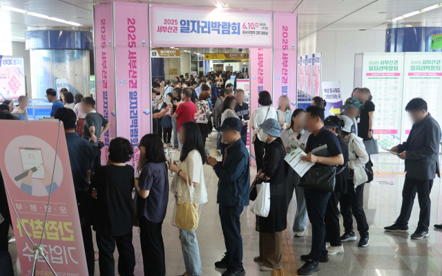 10일 부산도시철도 3호선 강서구청역 대합실에서 열린 ‘2025 서부산권 일자리박람회’에서 구직자들이 현장면접과 이력서 작성을 하고 있다. 이날 박람회에는 총 45개 업체가 참가해 채용 면접 및 상담을 진행했다.