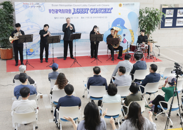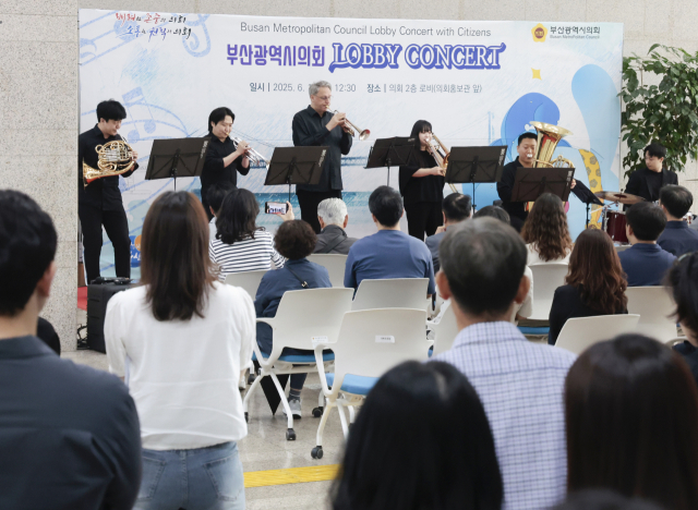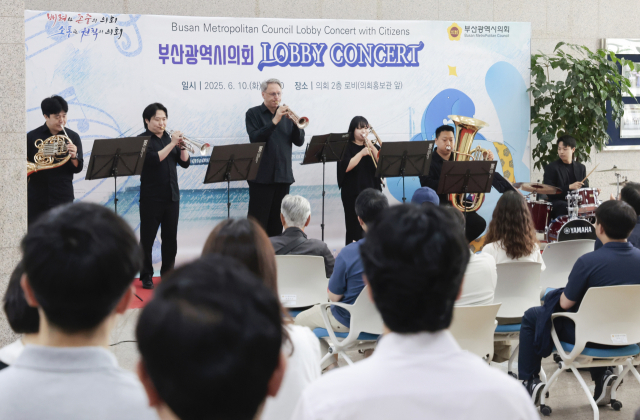 ‘부산시의회 로비 콘서트’가 10일 오후 부산시의회 2층 로비에서 열려 부산시립교향악단 금관 앙상블이 공연하고 있다.정대현 기자 jhyun@