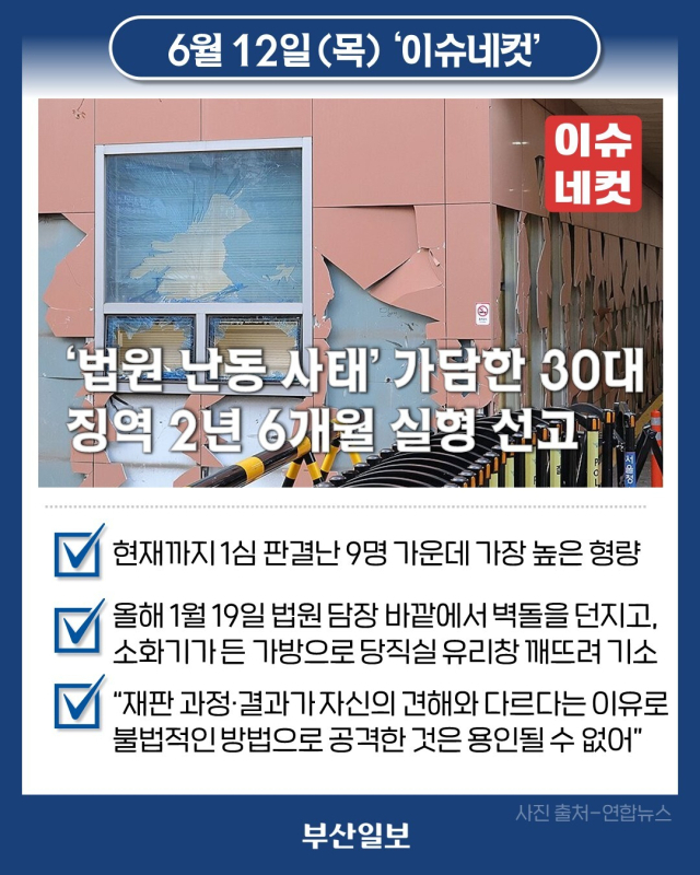 지난 1월 서울서부지법 난동 사태에 가담한 30대 남성 A 씨가 1심에서 특수공용물건손상, 특수건조물침입 등 혐의로 징역 2년 6개월의 실형을 선고받았습니다. 서부지법 난동 가담자들 가운데 현재까지 1심 판결이 내려진 9명 가운데 가장 높은 형량을 선고받은 것인데요. A 씨는 지난 1월 19일 서울서부지법 1층 현관 부분에 진입하는 과정에서 법원 담장 바깥에서 벽돌을 던지고 소화기가 든 가방으로 법원 당직실 유리창을 깨뜨린 혐의 등으로 재판에 넘겨졌습니다. 재판부는 "재판 과정이나 결과가 자신의 견해와 다르다는 이유만으로 불법적인 방법으로 법원을 공격하는 것은 용인될 수 없다"고 밝혔습니다. 또 A 씨가 범행을 반성하는 점, 범죄 전력이 없는 점, 오랜 구금 생활로 건강 상태가 좋지 않은 점 등을 고려했다면서도 "실형 선고가 불가피하고 높은 형을 선고할 수밖에 없다"고 덧붙였습니다.