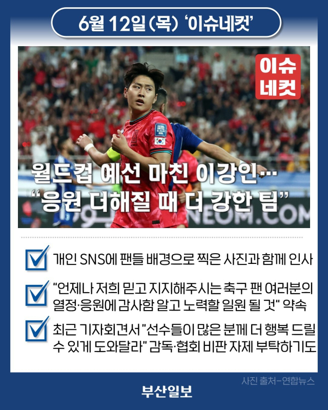 이강인이 자신의 SNS를 통해 2026 국제축구연맹(FIFA) 북중미 월드컵 3차 예선 쿠웨이트 전을 마치고 팬들을 배경으로 찍은 사진과 함께 감사 인사 글을 올렸습니다. 그는 "무엇보다도 팬 여러분의 뜨거운 응원이 함께 만들어낸 값진 성과라 생각한다"면서 "월드컵이라는 무대에 이르기까지 이 모든 과정이 팬 여러분과 하나의 목표를 향해 함께 나아가는 여정이라 생각한다"고 말했습니다. 또한 "여러분의 응원과 관심이 더해질 때, 우리는 더 강한 하나의 팀이 되어 그에 걸맞은 결과를 함께 만들어갈 수 있다고 항상 믿어왔다"면서 "언제나 저희를 믿고 지지해주시는 모든 축구 팬 여러분의 열정과 응원에 감사함을 알고 노력하는 대표팀의 일원이 되겠다"고 약속했습니다. 앞서 이강인은 쿠웨이트전 직후 기자회견에서는 "선수들이 많은 분께 더 행복을 드릴 수 있는 축구를 할 수 있도록 조금만 도와주셨으면 좋겠다"면서 홍명보 감독과 대한축구협회를 향한 과도한 비판을 자제해달라고 부탁하기도 했습니다.