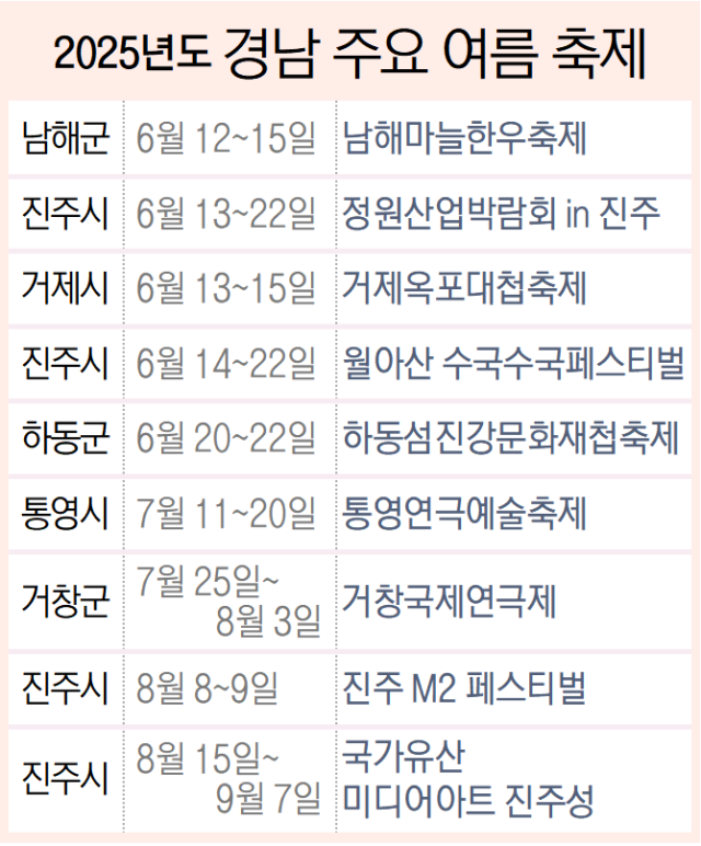 경남은 이번 주부터 크고 작은 여름 축제가 연이어 열린다. 진주시에서는 6월 13일부터 22일까지 정원산업박람회가, 14일부터 22일까지는 월아산 수국수국 페스티벌이 열린다. 또 남해 마늘한우축제(6/12~15), 거제 옥포대첩 축제(6/13~15), 하동섬진강문화재첩축제(6/20~22), 통영 연극예술축제(7/11~20), 거창국제연극제(7/25~8/3) 등도 관광객을 맞는다. 여름철 관광객 유입에 목을 매는 지자체들로선 여름 축제 성패가 무엇보다 중요한데, 장마와 태풍이라는 암초를 만난 셈이다.