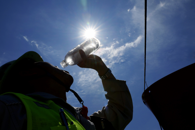 거제 한 조선소 노동자가 냉동 생수로 더위를 식히고 있다. 부산일보DB